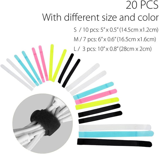 Avantree 20-Pack Reusable Cord Organizer and Cable Management Straps for Earbuds, Headphones, and Electronics – Assorted Sizes and Colors