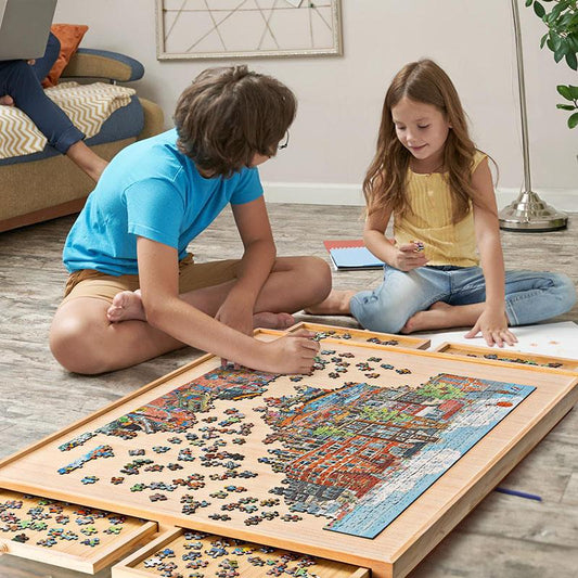 TEAKMAMA 1500-Piece Wooden Jigsaw Puzzle Table with Legs, 4 Drawers & Protective Cover - Portable 34” x 26.3” Folding Puzzle Board for Adults