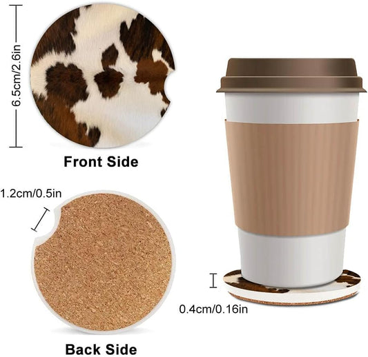 Absorbent Cowhide Car Coasters - Set of 2, Ceramic Stone Drink Holders with Finger Notch and Farm Animal Print Design