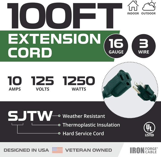 Iron Forge Cable 100 FT Green Outdoor Extension Cord - 16/3 SJTW Weatherproof, 3-Prong, UL Listed for Yard and Garden Use