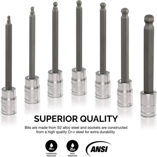 Neiko 10072A 3/8-Inch Drive Extra Long Allen Hex Bit Socket Set, SAE Sizes 1/8-Inch to 3/8-Inch, 7-Piece, Made from S2 and Cr-V Steel